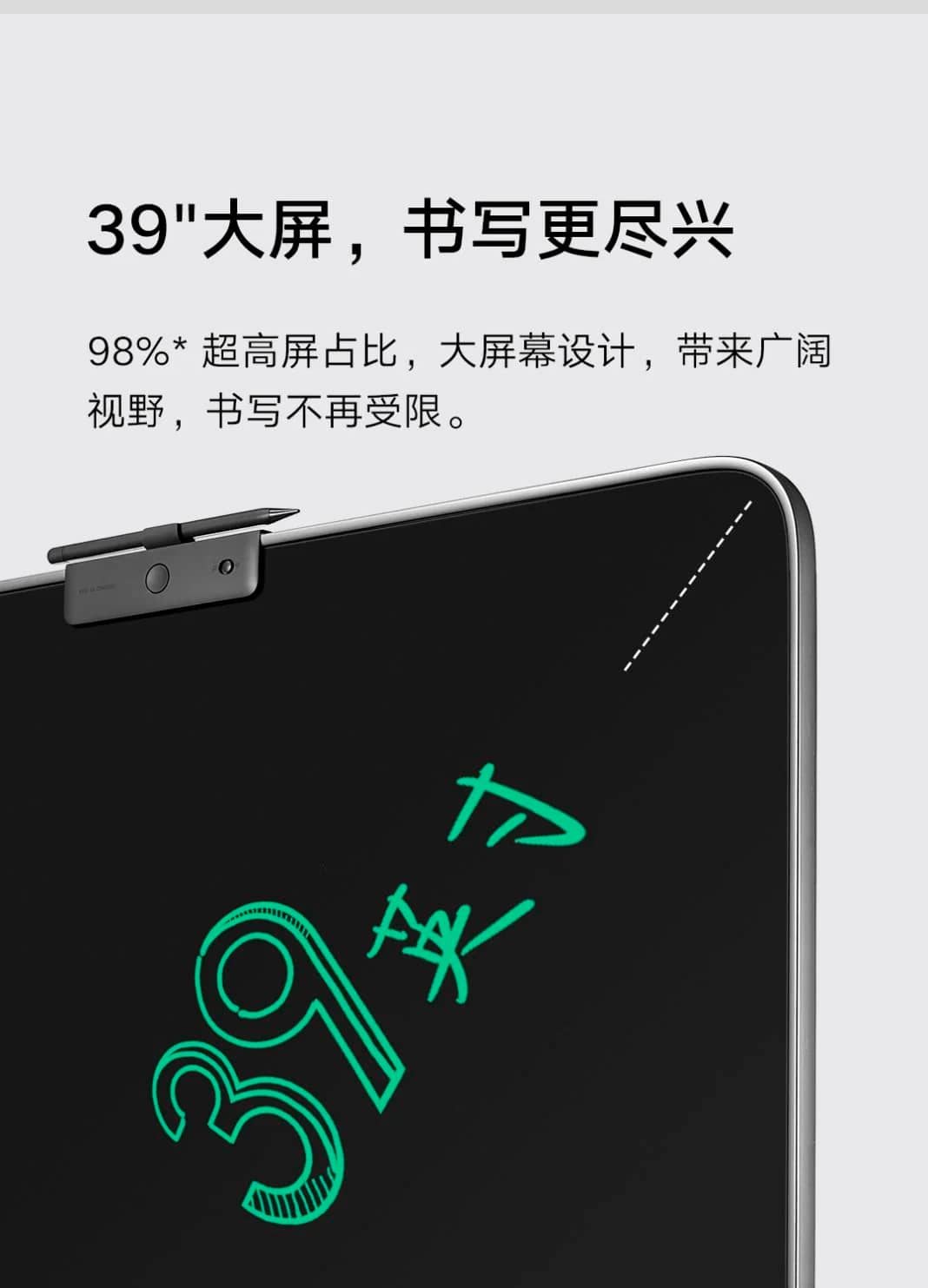 Xiaomi Mijia LCD Blackboard має розмір 39 дюймів, рамки товщиною всього 6 мм, співвідношення екрану до корпусу 98%, підтримує функцію поділу екрана, що дозволяє створювати дисплей до 57 дюймів, об'єднавши 2 такі дошки, або 78 дюймів шляхом поєднання трьох дощок, без використання фізичних з'єднувачів чи магнітів. Крім того, пристрій розроблено з урахуванням захисту очей, звільнено від шкідливого випромінювання синього світла.