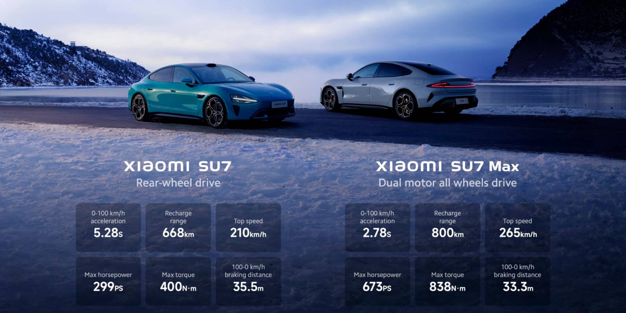 - Xiaomi SU7: задній привід з одним двигуном потужністю 299 к.с., розгоном до 100 км/год за 5,28 секунди, максимальною швидкістю 210 км/год і запасом ходу 668 км.