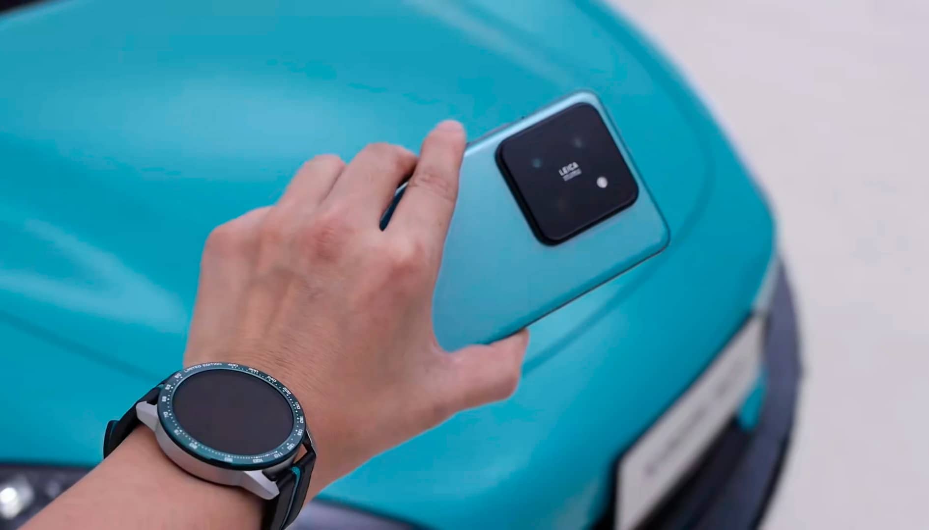 Наприкінці ролика засвітилися лімітовані Xiaomi 14 та Watch S3 у кольорі Aqua Blue. Пристрої представили разом із Xiaomi SU7.