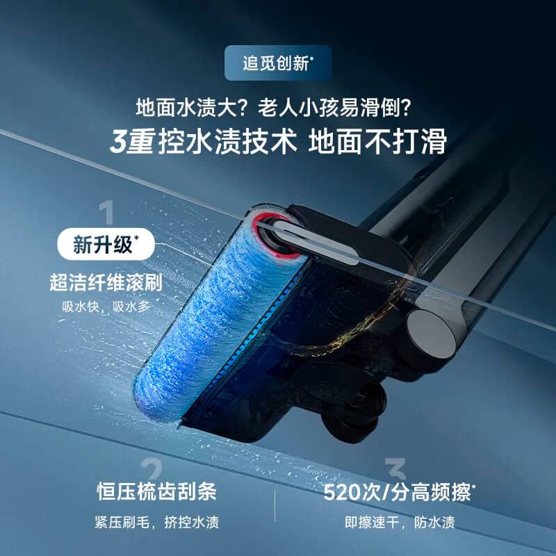 Dreame H2O Super Power Edition включає технологію потрійного контролю за плямами води, включає щітку із суперчистої волокнистої ворсини, яка швидко вбирає воду, зубчасті гребені постійного тиску видаляють надлишок води, високочастотне витирання миттєво висушує підлогу, мінімізуючи ризик ковзання та падіння.