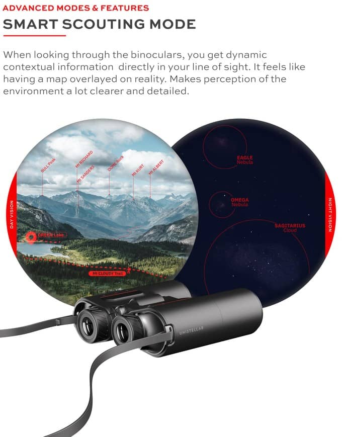 Unistellar Envision може розпізнавати до 200 000 об'єктів на нічному небі та понад 1 млн пам'яток, таких як гори та туристичні стежки. Контекстна інформація в реальному часі накладається поверх зображення, що допомагає користувачу краще орієнтуватися.