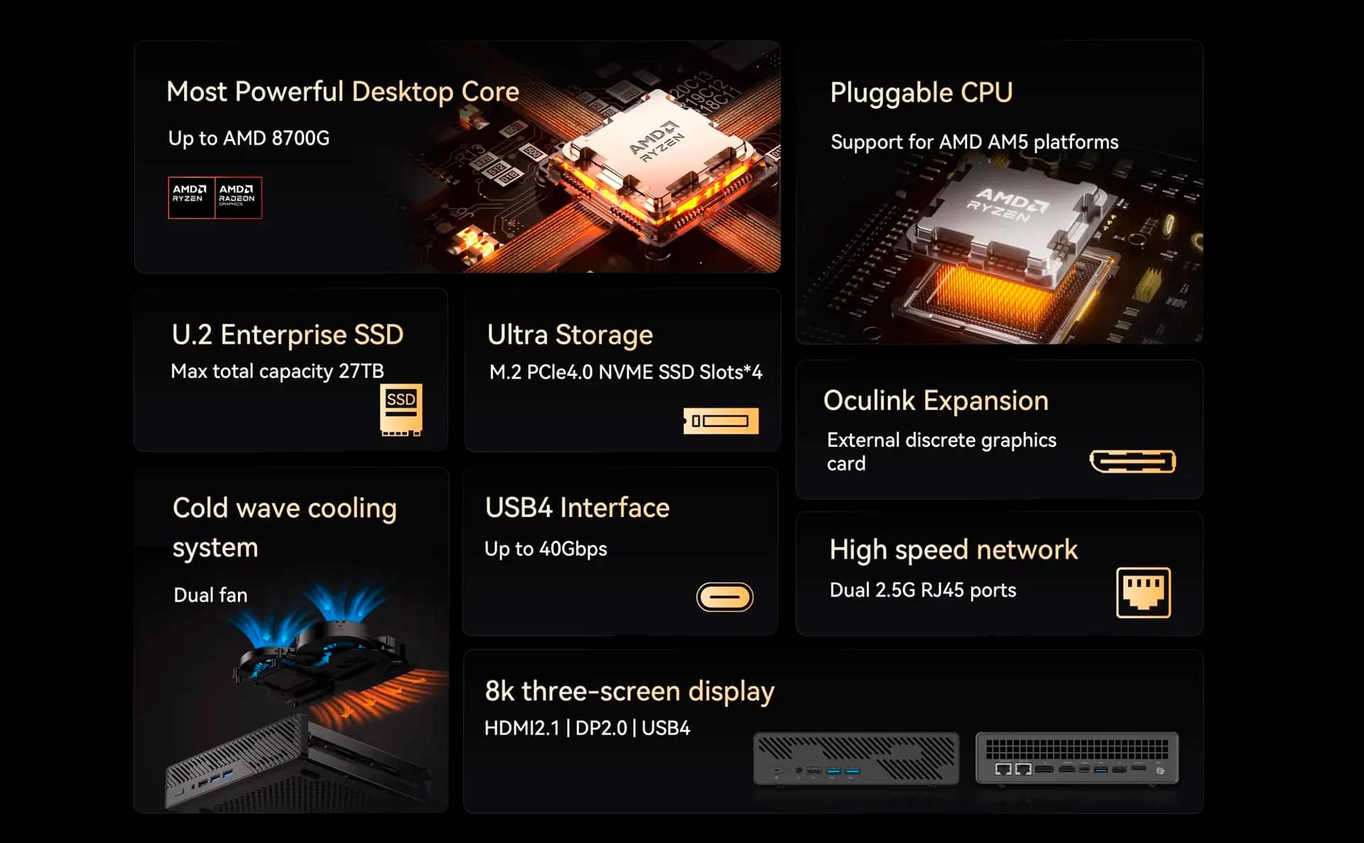 Новий пристрій оснащено досить потужними процесорами серій AMD Ryzen 7000, 8000 чи 9000, 32 ГБ оперативної пам'яті з можливістю розширення до 96 ГБ, 1 ТБ пам'яті SSD формату M.2.