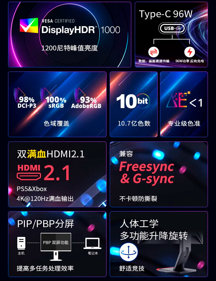 Модель використовує новітню технологію AUO Fast IPS, пропонуючи час відгуку 1 мс (GTG) для швидкої реакції та зменшення розмиття під час руху. Монітор має сертифікацію VESA DisplayHDR 1000 з піковим рівнем яскравості 1200 ніт та контрастністю 1 000 000:1, забезпечуючи видатну глибину та деталізацію кольору в яскравих та темних сценах. Екран підтримує 10-бітну глибину кольору та професійну точність передачі кольору з ΔE<1, охоплюючи 98% колірного простору DCI-P3, 100% sRGB і 93% AdobeRGB.
