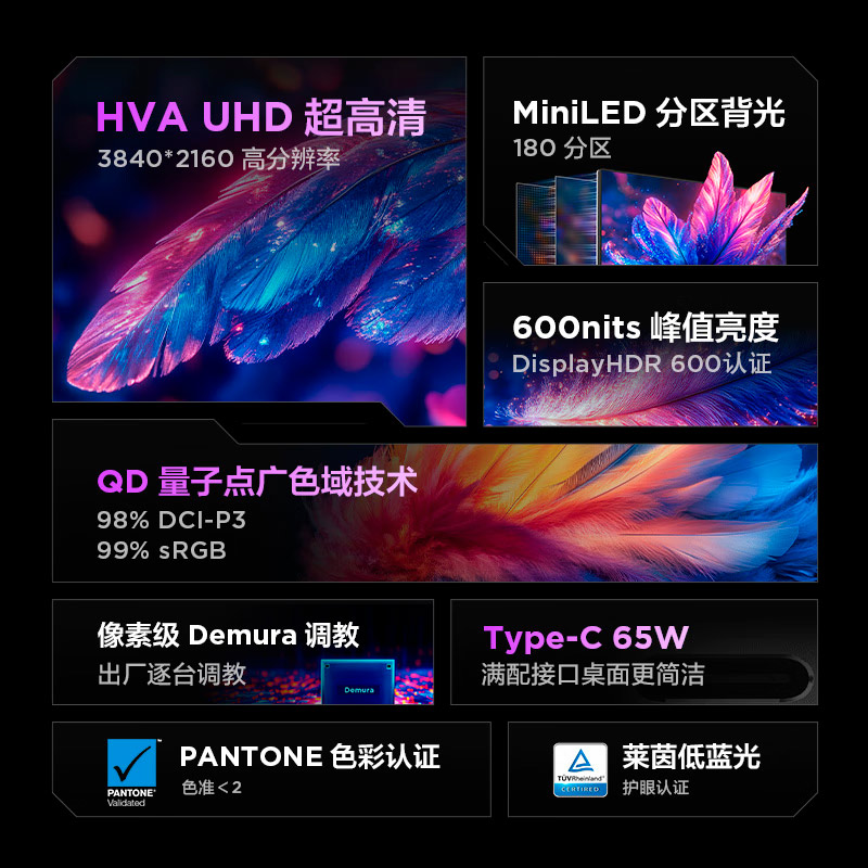 Ffalcon Thunderbird U6 має 27-дюймовий екран з роздільною здатністю 4K UHD (3840 х 2160 пікселів), частотою оновлення 60 Гц, технологією Quantum Dot (QD) з широким колірним охопленням 98% DCI-P3 і 99% sRGB, сертифікацією PANTONE, точністю передачі Delta E < 2.