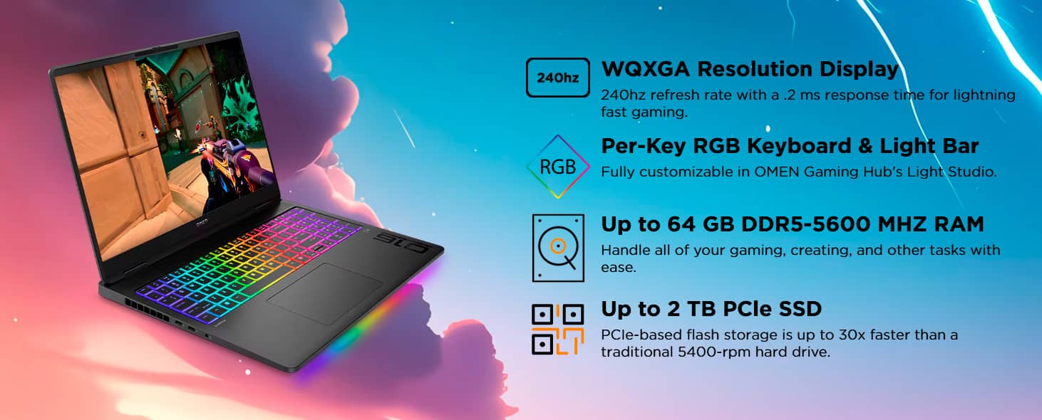 HP Omen MAX 2025 пропонує 16-дюймовий екран IPS з роздільною здатністю 2560 х 1600 пікселів, частотою 240 Гц, яскравістю 500 ніт, покриттям 100% sRGB, підтримкою VRR. У нього є 2 порти Thunderbolt 4 (40Gbps, 100W Power Delivery), 2 порти USB-A (10Gbps), HDMI 2.1 (висновок 8K@60Hz), Ethernet 2.5G, Wi-Fi 7 та Bluetooth 5.4.