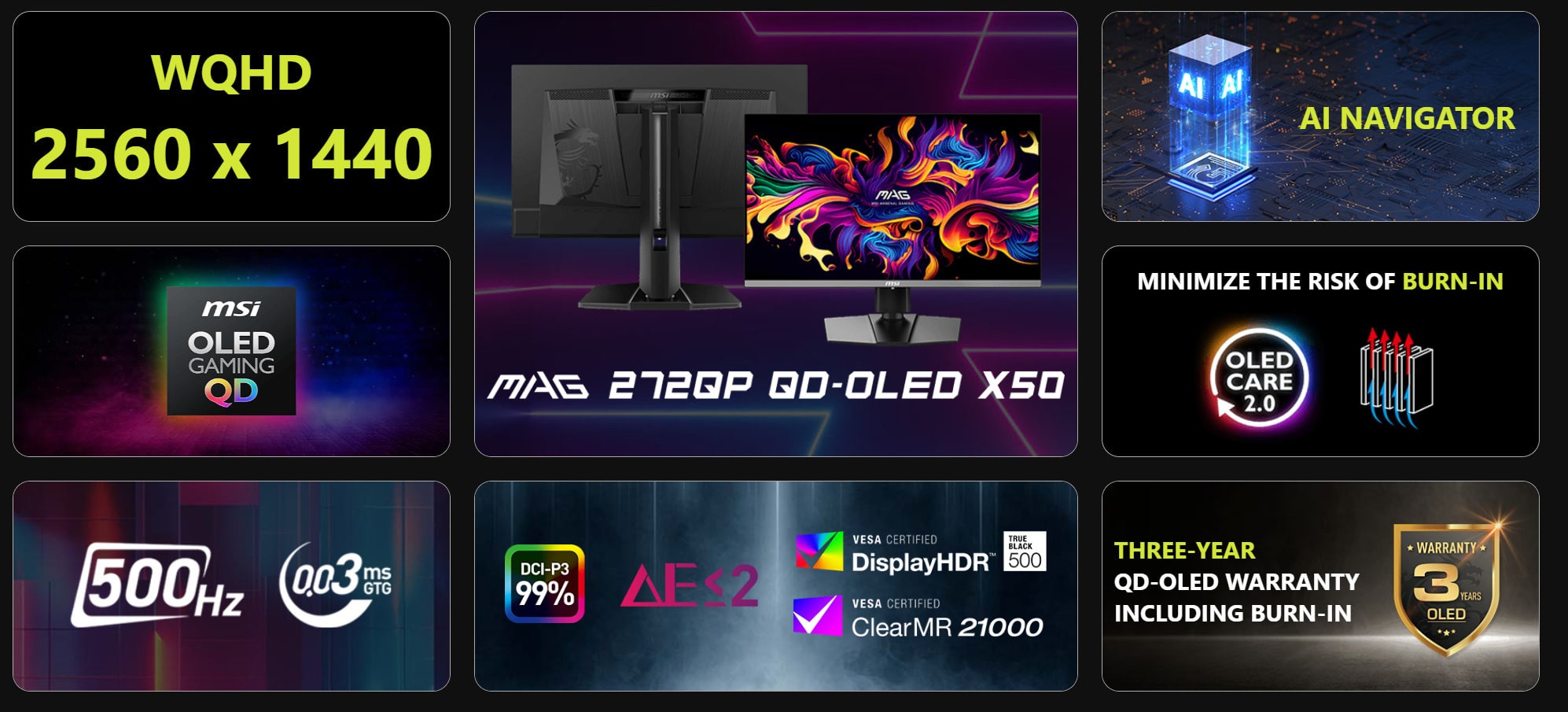 MSI представила MAG 272QP QD-OLED X50 на базі 3-го покоління панелей Samsung. Монітор також працює на частоті 500 Гц, підтримує HDR (DisplayHDR True Black 500, ClearMR 21000) та оснащений фірмовим захистом MSI OLED Care, що знижує ризик вигоряння пікселів. Додатково передбачено режим EOTF Boost для більш високої яскравості HDR.