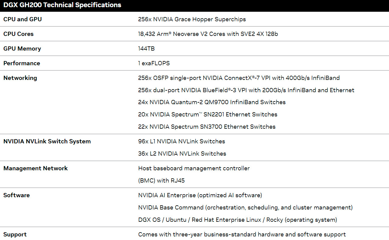 В основі комп'ютера лежить нова система NVLink, що поєднує 256 суперчіпів Grace Hopper в один графічний процесор. За рахунок цієї технології і досягається рекордна потужність комп'ютера, а також неймовірний обсяг пам'яті 144 терабайти. Це у 500 разів більше, ніж забезпечує одна система DGX A100.