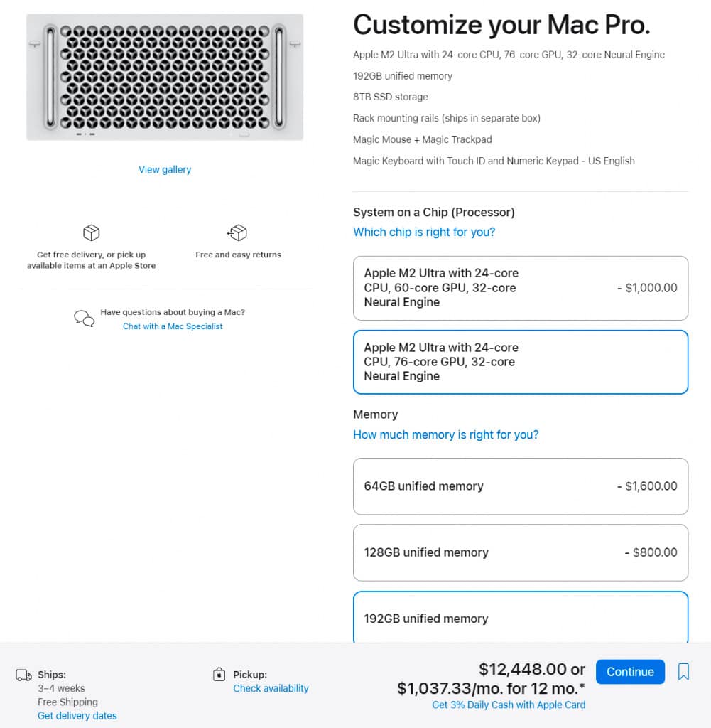 Mac Pro в базовій конфігурації коштує 6999 доларів. За ці гроші покупець отримує комп'ютер у сталевому корпусі формату башта з ніжками. Всередині процесор M2 Ultra з 24 ядрами CPU, 60-ядерним графічним ядром та 32-ядерним ядром для ШІ, 64 ГБ уніфікованої пам'яті та SSD-накопичувач на 1 ТБ, також додається комплект з мишки та клавіатури. За додаткові гроші можна поставити процесор з покращеною графікою, більше пам'яті, замінити у корпуса ніжки на коліщатка, а замість мишки або на додаток до неї взяти трекпад. Якщо вибрати найдорожче, це обійдеться в 12 348 доларів.
