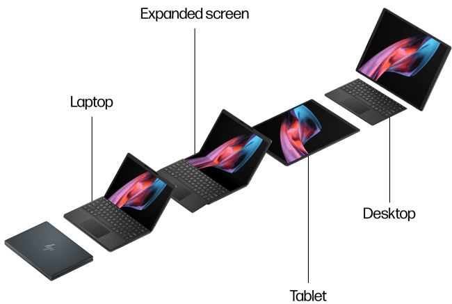 HP Spectre Foldable PC оснащений 17-дюймовим екраном OLED з роздільною здатністю 2.5K, підтримкою HDR, яскравістю 400 ніт SDR, 500 ніт HDR, 99.5% DCI-P3 і вбудованою підставкою. Це перший пристрій, який має повноцінну клавіатуру та півтора екрани без необхідності використовувати додаткові кабелі для заряджання клавіатури або стілусу.