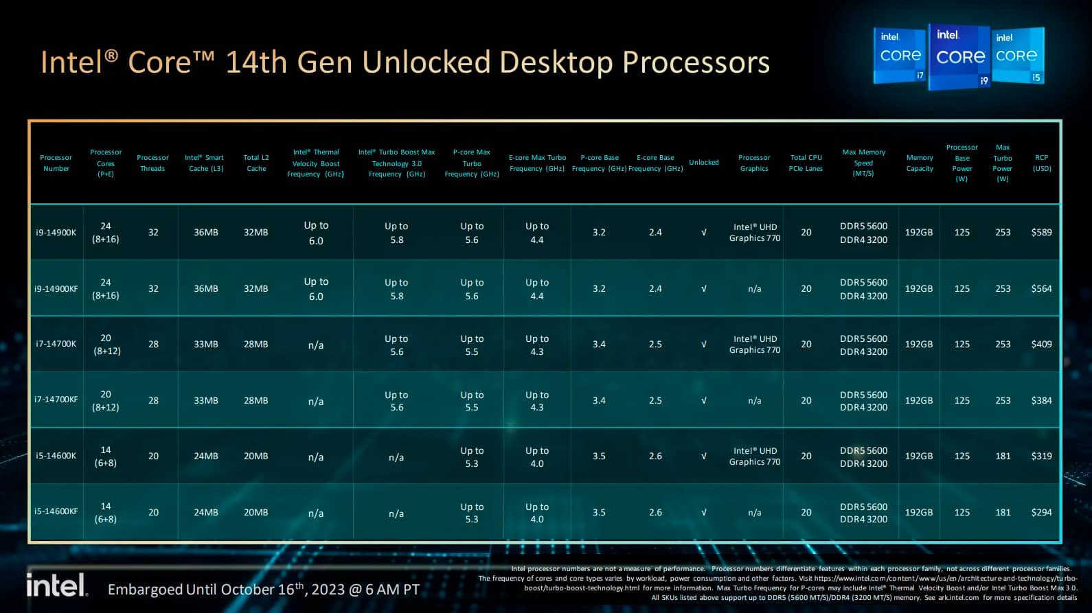 Середньобюджетний процесор Core i5-14600K має на борту 14 ядер (6+8), 20 потоків на максимальній частоті 5,3 ГГц. Його вартість складе $319, а 14600KF (без відеоядра) — $294.