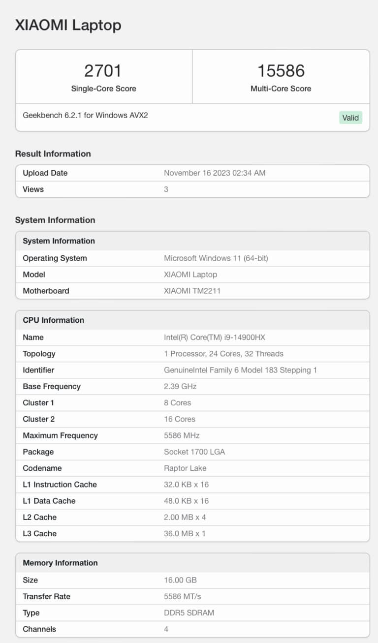 Потенційна новинка зареєстрована у Geekbench під номером моделі TM2211. Згідно з бенчмарком, в основі ноутбука будуть чіпи i9-14900HX та i5-14500HX.