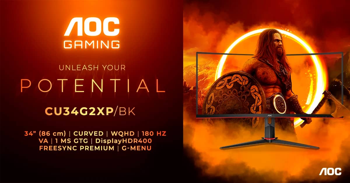AOC Gaming CU34G2XP/BK — це 34-дюймовий вигнутий ігровий монітор з радіусом вигину 1500R, покриттям антивідблиску (AG), роздільною здатністю 3440 х 1440 пікселів, співвідношенням сторін 21:9, підсвічуванням WLED, частотою оновлення 180 Гц, часом відгуку 1 мс (GTG та MPRT).