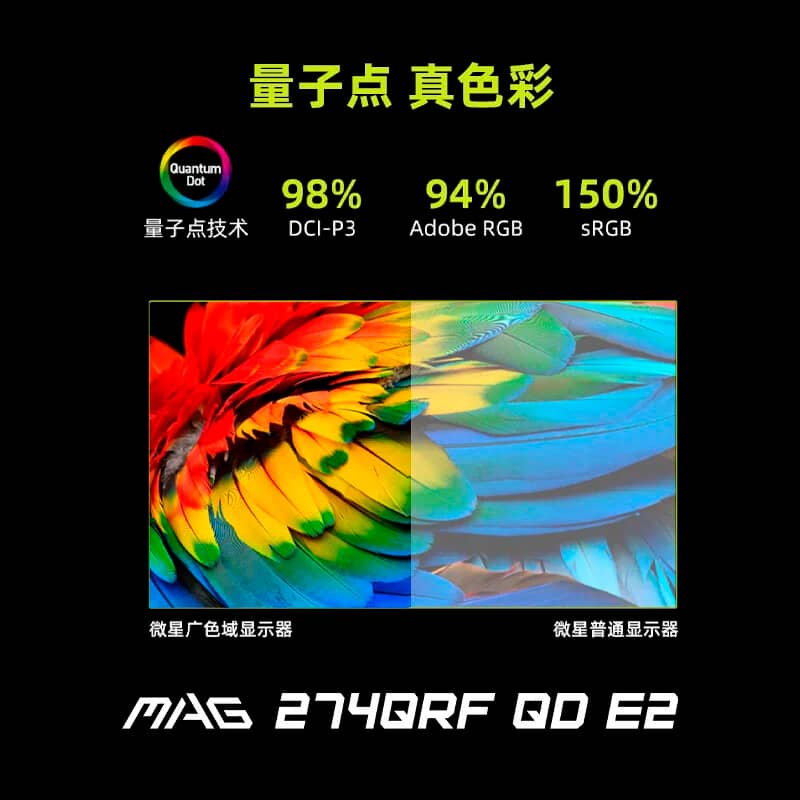 MSI MAG 274QRF-QD E2 оснащено 27-дюймовою панеллю Rapid IPS з роздільною здатністю 2K (2560 х 1440 пікселів), частотою оновлення 180 Гц, часом відгуку 1 мс, технологією Quantum Dot, що покращує колірну продуктивність з покриттям 98% DCI-P3, 94% Adobe RGB та 150% sRGB.