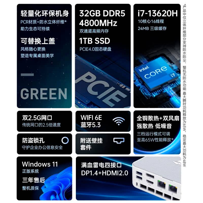 Machenike Creator MINI II оснащено процесором Intel Core i7-13620H, корпусом розміром лише 0.7 літри з матеріалу PCR, з можливістю заміни верхньої кришки та кріпленням VESA для встановлення на монітори з отворами VESA.