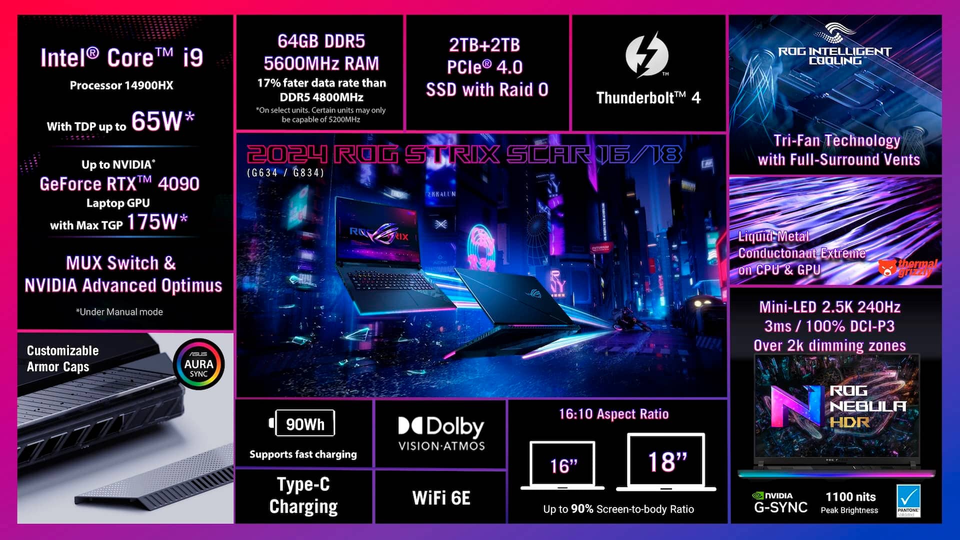 Asus також показала оновлений ROG Strix SCAR 18 — перший ноутбук компанії із 18-дюймовим mini-LED екраном. Ця та інші моделі Strix оснащуються процесором до Intel Core i9 14900HX, відеокартою до RTX 4090, до 64 ГБ оперативної пам'яті та SSD до 4 ТБ. Ціни стартують від 2899,99 долара за 16-дюймові моделі та від 2999,99 долара — за 18-дюймові.