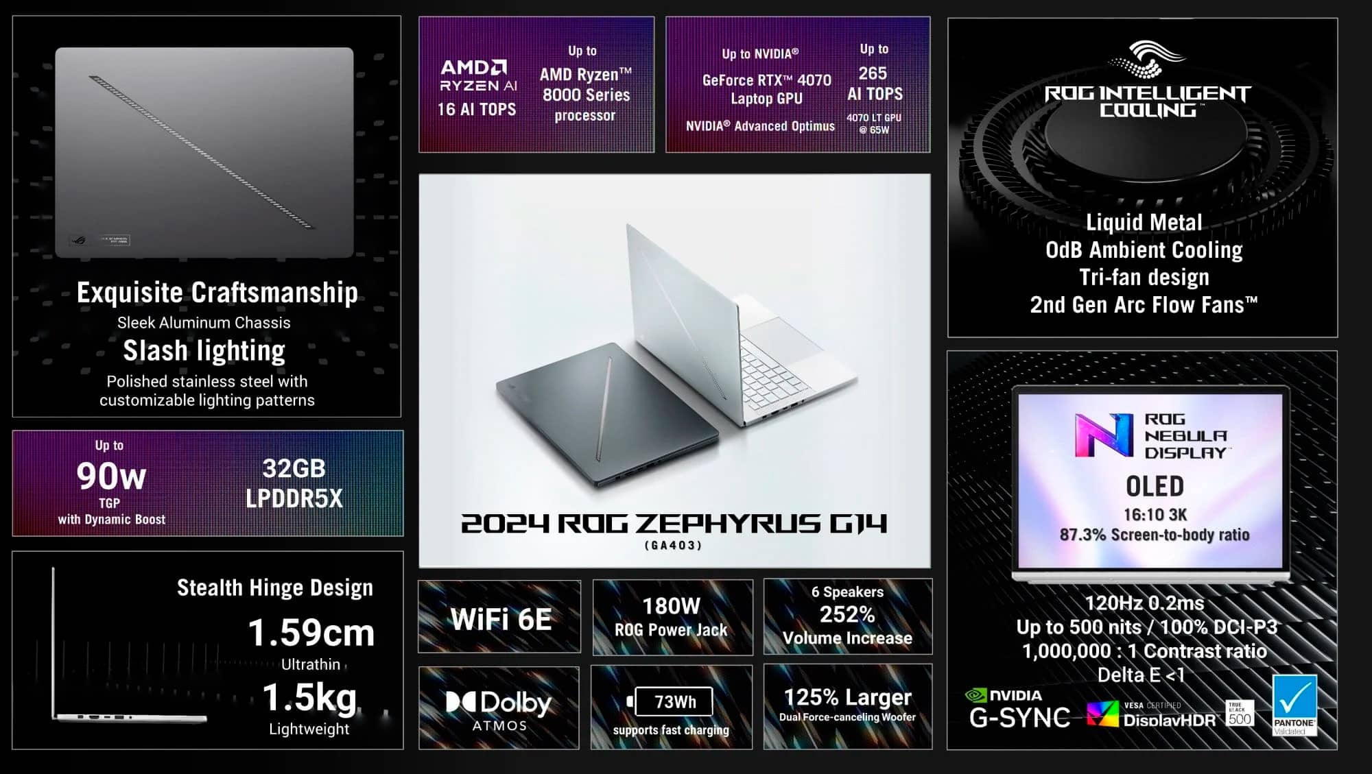 Asus ROG Zephyrus G14 пропонується з процесорами AMD Ryzen 8000-ї серії та відеокартою до NVIDIA GeForce RTX 4070. Крім того, заявлено до 32 ГБ оперативної пам'яті SSD об'ємом до 1 ТБ.
