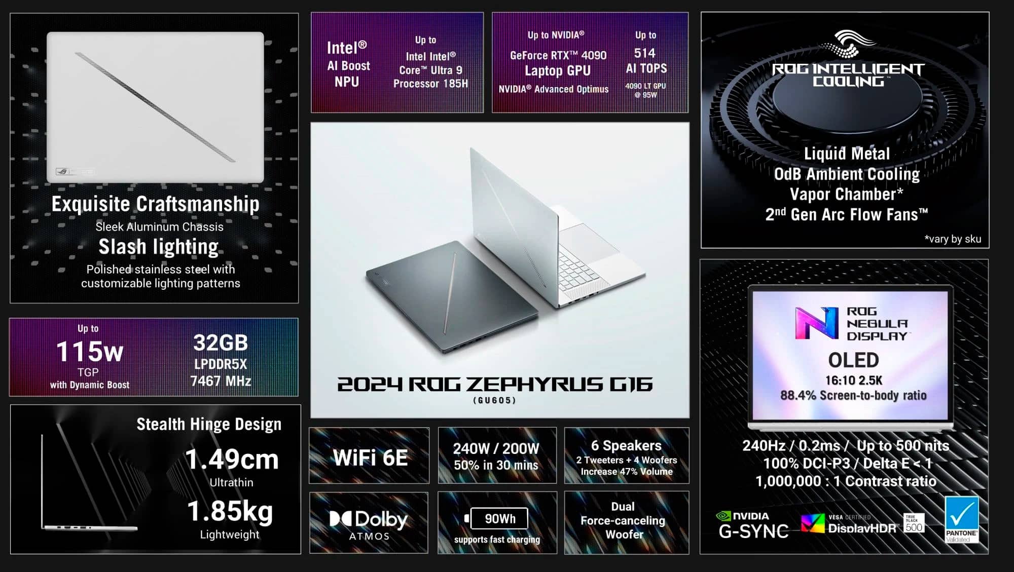 У топовій модифікації ROG Zephyrus G16 використовується Intel Core Ultra 9 185H та NVIDIA GeForce RTX 4090. Інші особливості включають Bluetooth 5.3, Wi-Fi 6E, HDMI 2.1, USB 4 та Thunderbolt. Є і фірмове матричне підсвічування на кришці з можливістю відображення повідомлень та різних картинок або анімацій.