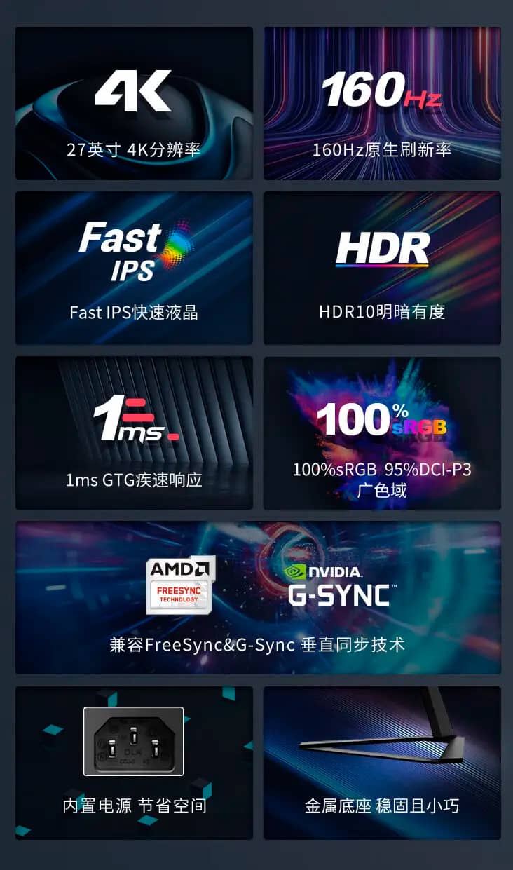 Новинка оснащена матрицею Fast IPS діагоналлю 27 дюймів з роздільною здатністю 3840×2160 пікселів, частотою оновлення до 160 Гц та часом відгуку 1 мс (GtG). Максимальна яскравість підсвічування дисплея становить 300 кд/м², заявлено охоплення 100% колірного простору sRGB.