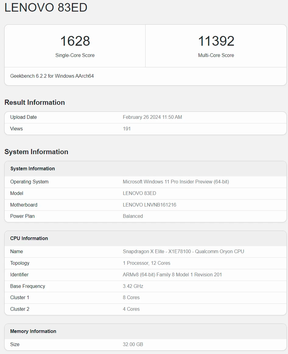 У Geekbench з'явився комп'ютер Lenovo 83ED із 12-ядерним Snapdragon X Elite-X1E78100. Чіп працює на частоті 3,42 ГГц, хоча здатний досягати і більш високих частот, судячи з попередніх тестів у Geekbench.