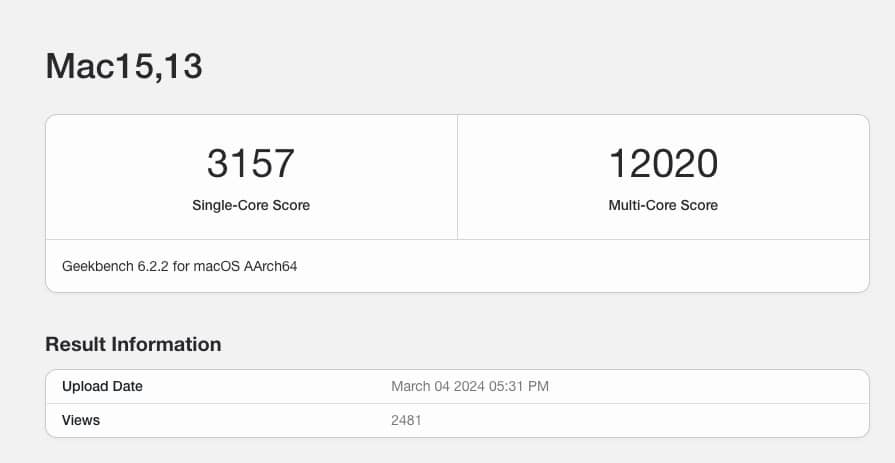 Згідно з наявними даними, у Geekbench 5 була протестована одна з топових моделей MacBook Air 2024 з 15-дюймовим дисплеєм. Ноутбук оснащений чіпом Apple M3 з 8 обчислювальними та 10 графічними ядрами, а також 16 ГБ оперативної пам'яті. Така модифікація набрала в Geekbench 3157 балів в одноядерному та 12020 балів у багатоядерному тестах.