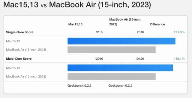 Для порівняння MacBook Air з M2 і 16 ГБ ОЗП в тому ж бенчмарку показував 2610 та 10120 балів відповідно. Отже, можна сказати, що в одноядерному тесті приріст продуктивності становив 20%, а багатоядерному — 18%.