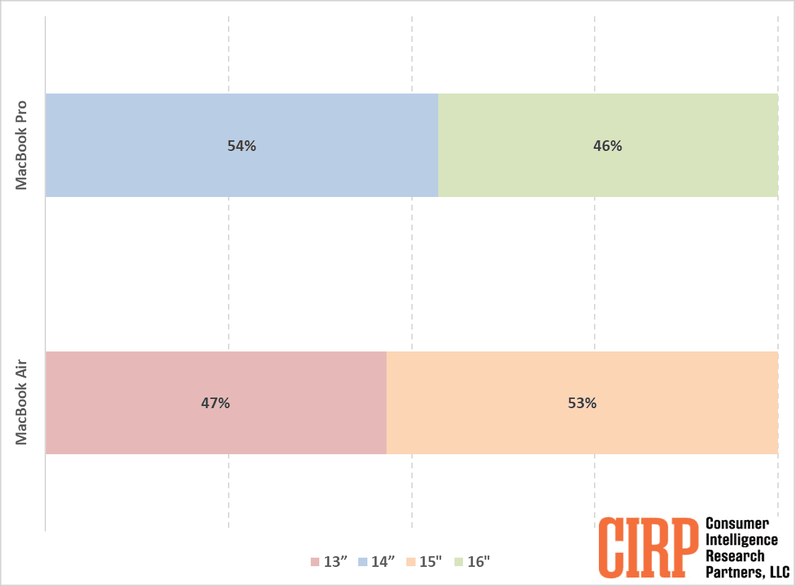 На MacBook Air припало 39%, що теж чимало. Незважаючи на те, що поточні моделі MacBook Air за продуктивністю значно наблизилися до MacBook Pro, вони все одно залишаються на другому плані популярності.