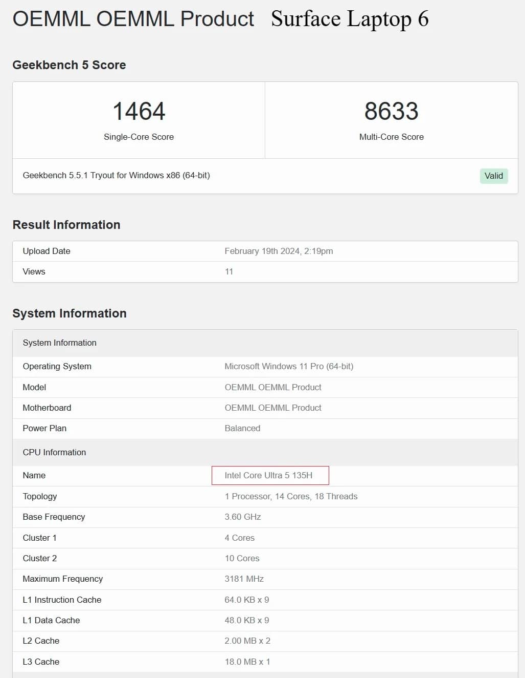 Обидва ноутбуки отримали процесори серії Intel Core Ultra. Surface Laptop 6 був протестований з 14-ядерним та 18-потоковим Core Ultra 5 135H. Лептоп набрав 1464 та 8633 балів у одноядерному та багатоядерному тестах.