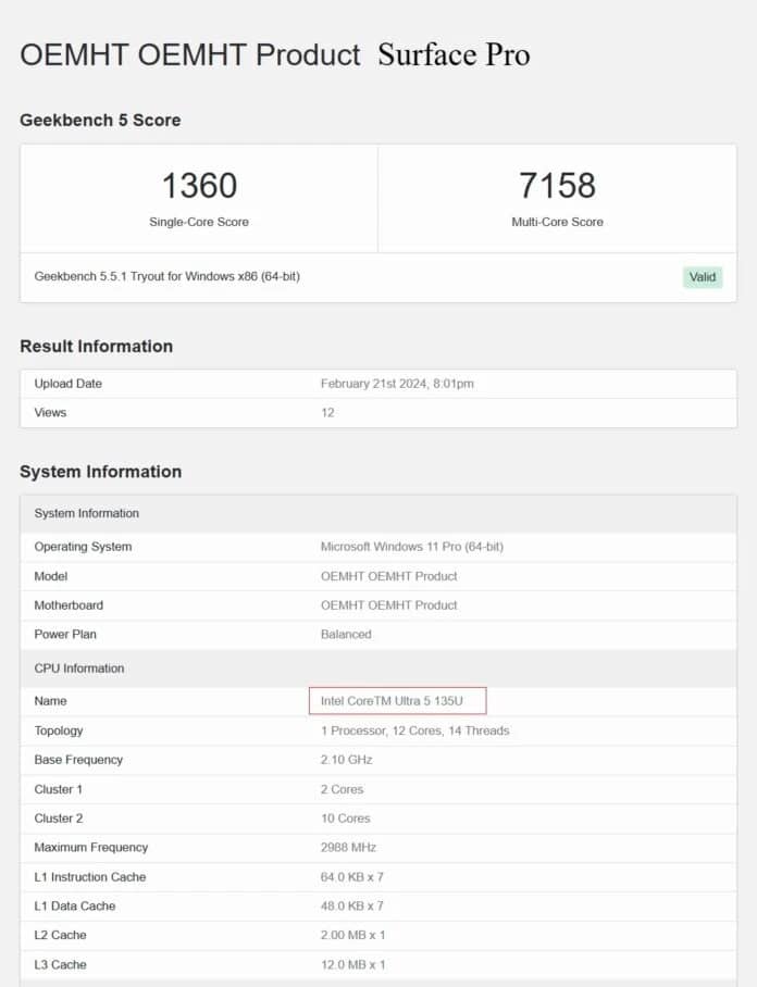 Протестований Surface Pro 10 оснащений 12-ядерним та 14-потоковим Core Ultra 5 135U. У цієї моделі результати в Geekbench гірші.