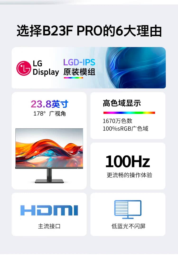 Геймери оцінять частоту оновлення матриці 100 Гц, яка дає більш плавний ігровий процес порівняно з традиційними 60 Гц дисплеями. Особливо цей параметр важливий у динамічних кіберспортивних дисциплінах. Щодо дизайну, F24B23F PRO відрізняється тонкими рамками навколо екрана, а його підставка забезпечує регулювання нахилу для зручного положення під час перегляду контенту. Також є кріплення VESA 100×100 мм, яке компенсує відсутність регулювання по висоті та повороту при купівлі відповідного механізму ніжки.