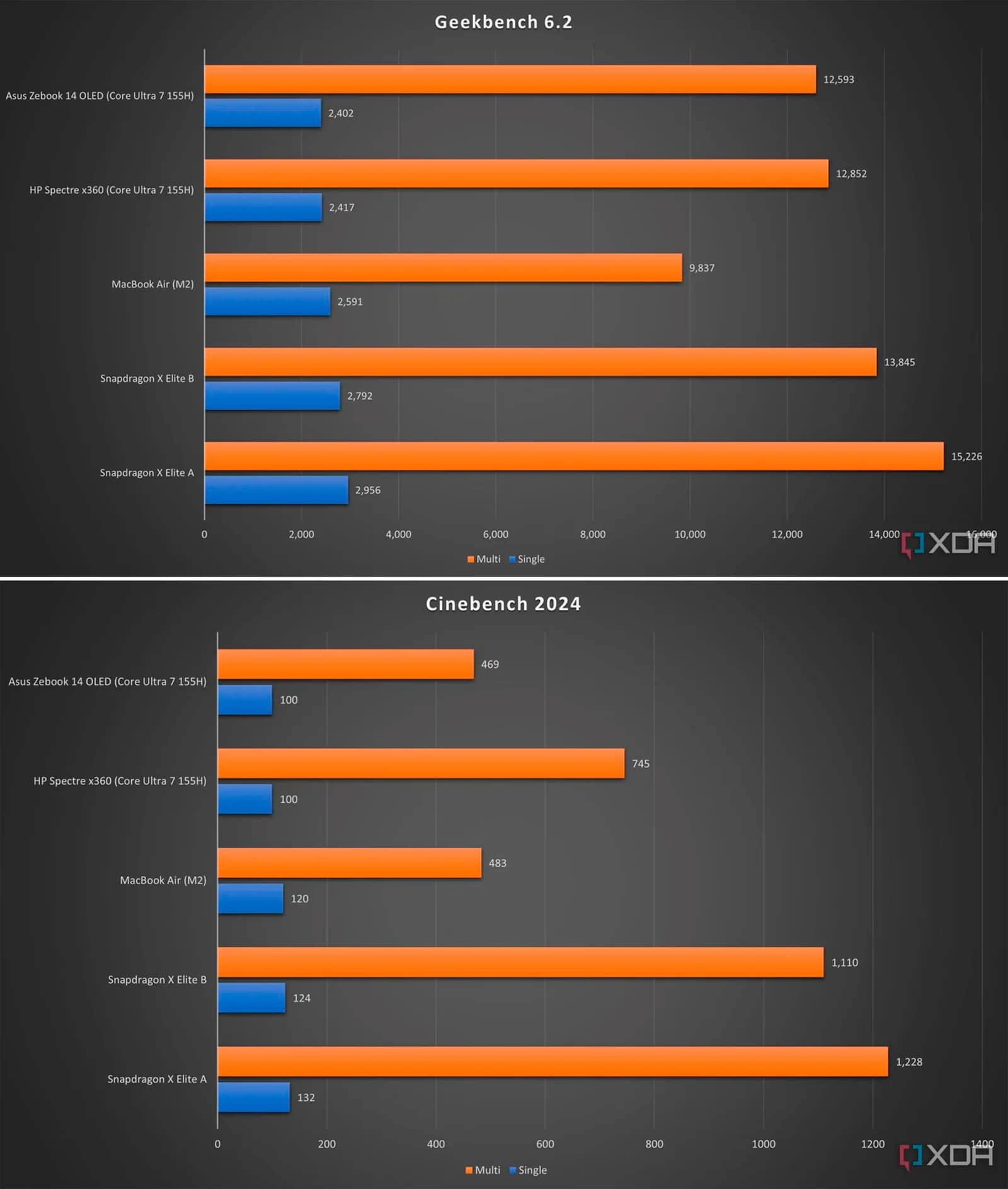 Порівняння Snapdragon X Elite з Apple M2 та Intel Core Ultra 7 (155H), джерело: XDA