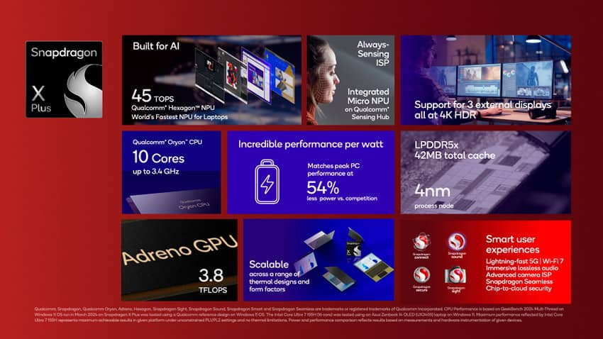 Qualcomm наголосила на можливості штучного інтелекту нових чіпів серії Snapdragon X. Чіп Snapdragon X Plus оснащено 10 кастомними ядрами CPU Oryon, створеними Qualcomm. За словами компанії, CPU забезпечує покращення продуктивності на 37% при зменшенні енергоспоживання на 54% порівняно з конкурентами.