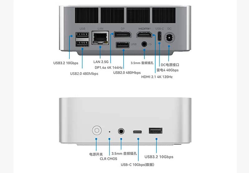 Beelink SEi14 оснащено двома слотами SODIMM, які можуть підтримувати до 96 ГБ оперативної пам'яті DDR5 із частотою 5600 МГц. У пристрою є два слоти PCI 4.0, що забезпечують до 8 ТБ пам'яті. Міні-комп'ютер пропонує порти USB-C (x1), USB 3.2 (x2), DP 1.4 (x1) та HDMI (x1), підтримує Bluetooth 5.2 та Wi-Fi 6.
