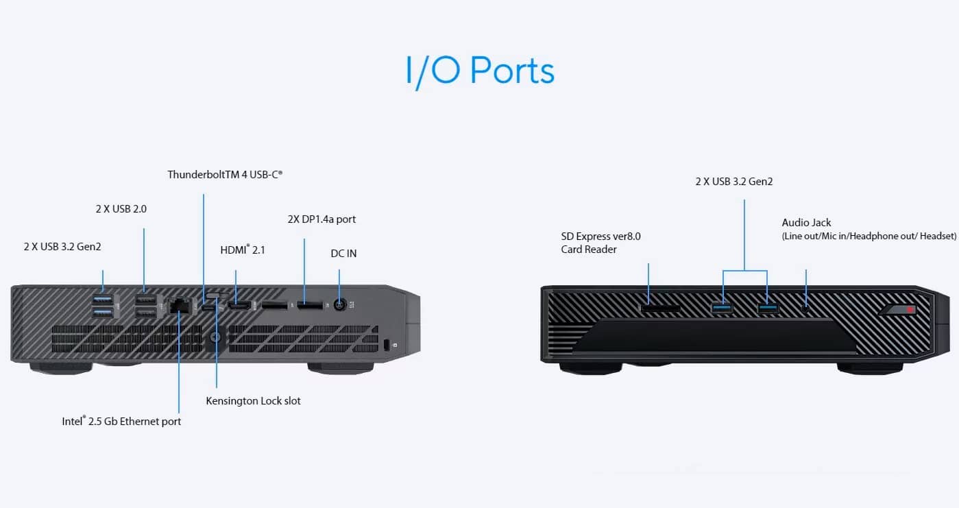 На корпусі пристрою є чотири роз'єми USB 3.2 Gen 2 Type-A, два USB 2.0 Type-A, один HDMI 2.1, пара DisplayPort 1.4a, а також Thunderbolt 4 та Ethernet. Доповнюють конфігурацію слот для карт пам'яті SD із підтримкою стандарту UHS-I та комбінований 3,5-мм аудіороз'єм.