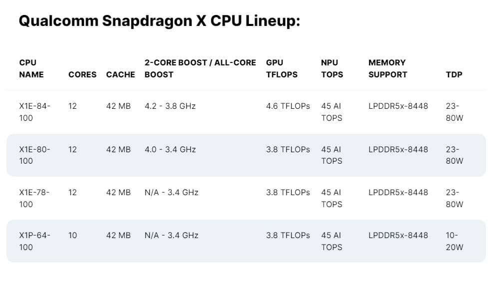 Qualcomm Snapdragon X Elite та X Plus отримали 12 ядер та працюють на частоті від 3,4 ГГц до 4,2 ГГц. Обидва чипи підтримують ОЗП LPDDR5x-8448 і оснащуються NPU з продуктивністю 45 TOPS.