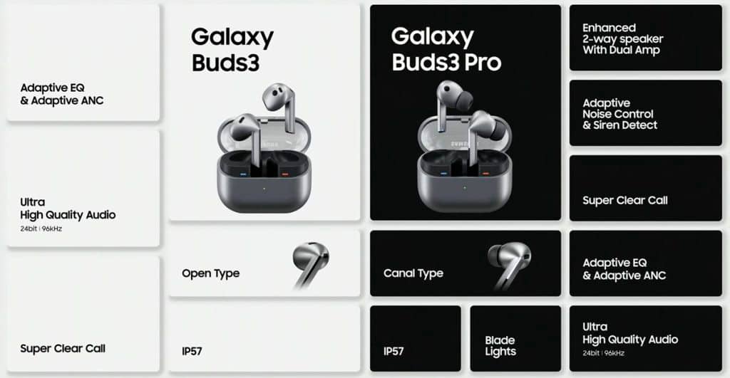 У серію входить базова модель та модель Pro. Samsung Galaxy Buds3 Pro оснащено двосмуговими динаміками з 6.1-мм планарними твітерами та 10.5-мм динамічними драйверами, а також подвійними підсилювачами. Кодек SSC оновлено для підтримки подвоєної частоти дискретизації.