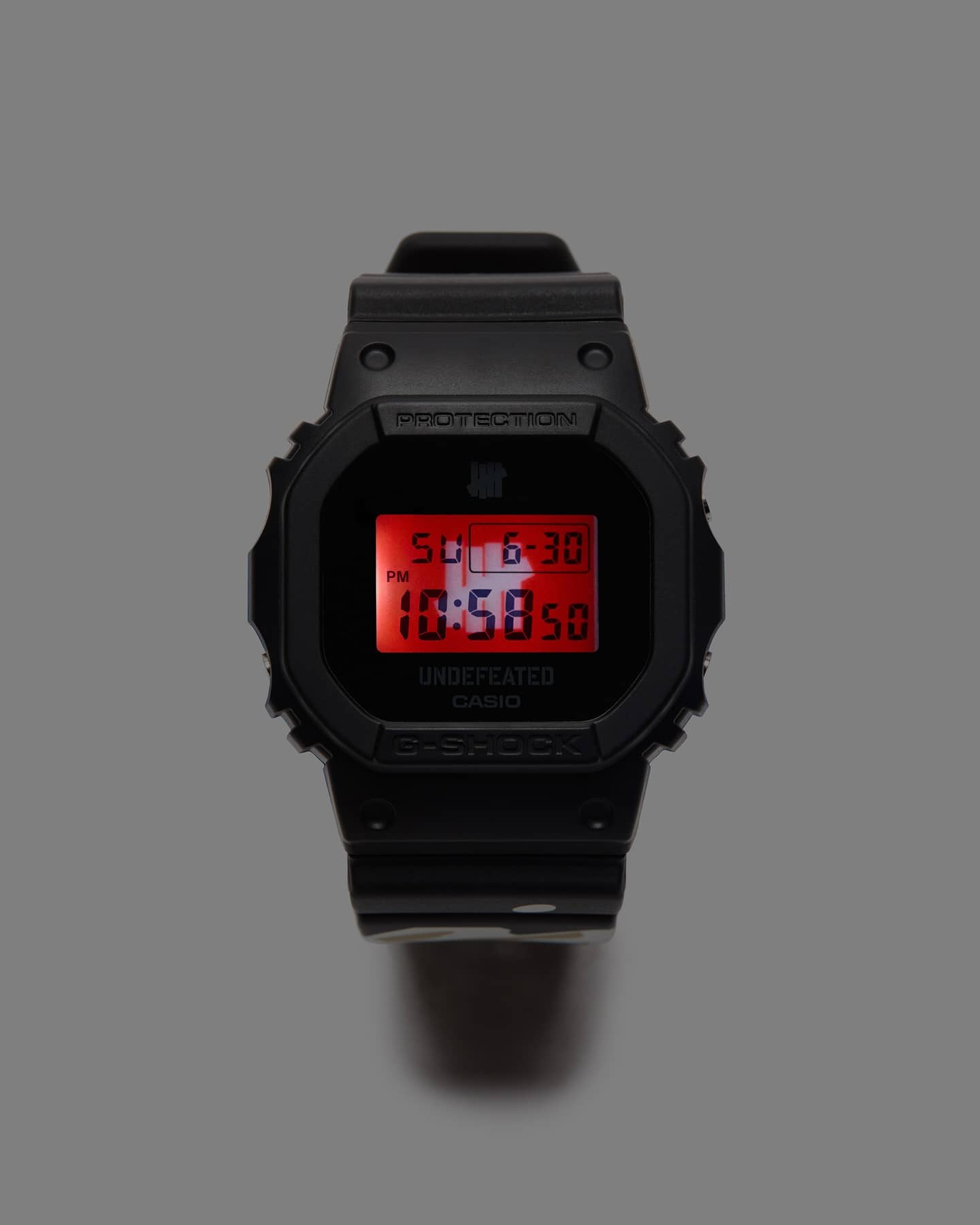 G-Shock x Undefeated DWE5600UD-1 оснащений зеленим LCD-дисплеєм та чорним корпусом, виконаним із комбінації смоли та вуглецевого волокна. Логотип Undefeated присутній у різних елементах дизайну, включаючи LED-підсвічування (біле та червоне). У комплекті — три змінні ремінці: напівпрозорий чорний, Storm Camo та Tiger Camo.
