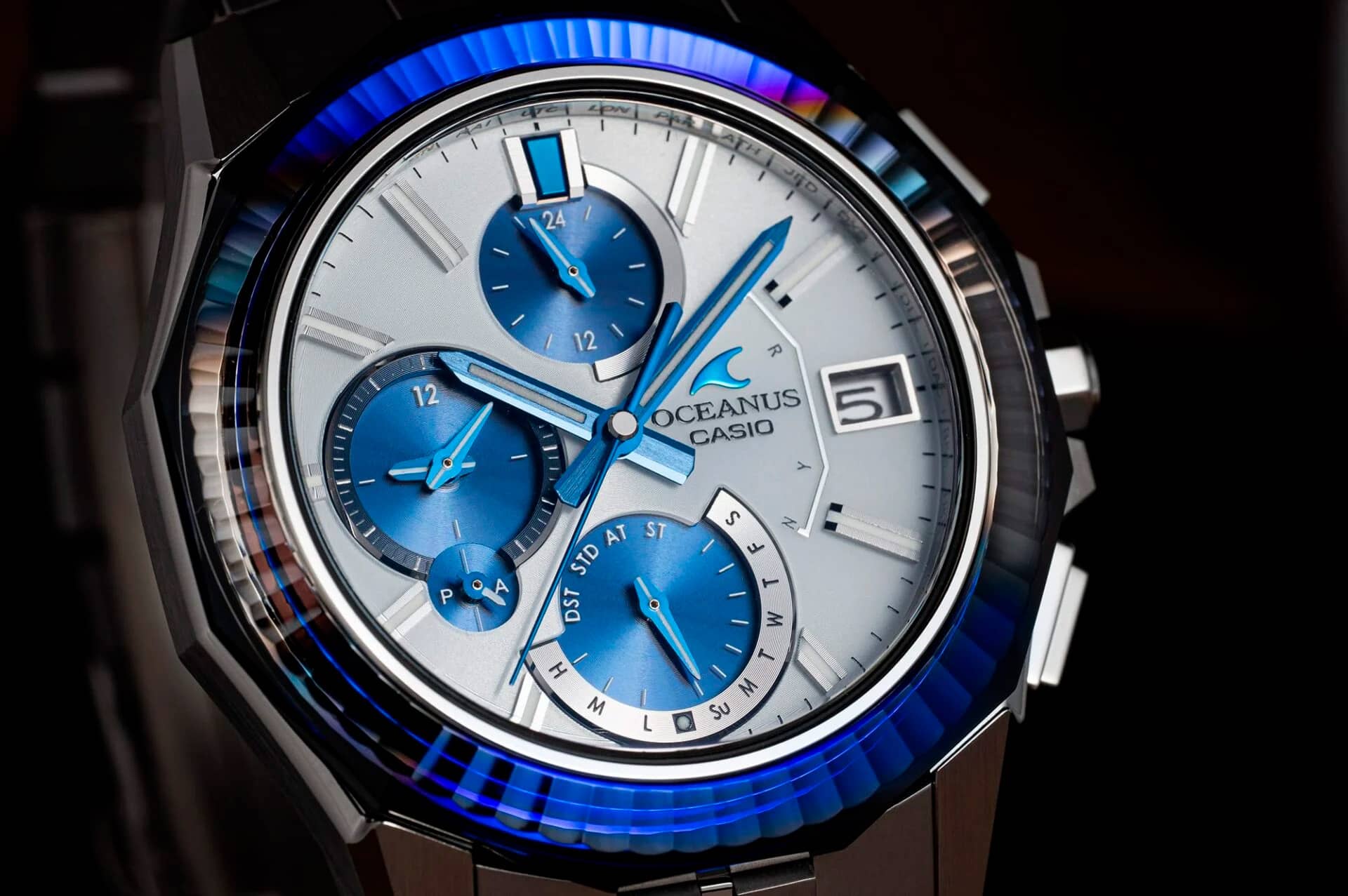 Циферблат виконаний у білому кольорі та використовує технологію сонячного живлення, при якій світло вловлюється через три додаткові індикатори, а основний циферблат залишається повністю відкритим та світлим. Підциферблати покриті напівпрозорим синім шаром, індекс на позначці 12 годин — із синім покриттям методом розпилення, а секундна стрілка анодована у синій колір. Поєднання білого та синього надає дизайну чистоти та виразності. На внутрішньому кільці лазером вигравіровано коди міст, а основні індекси відполіровано та вкрито сріблом.