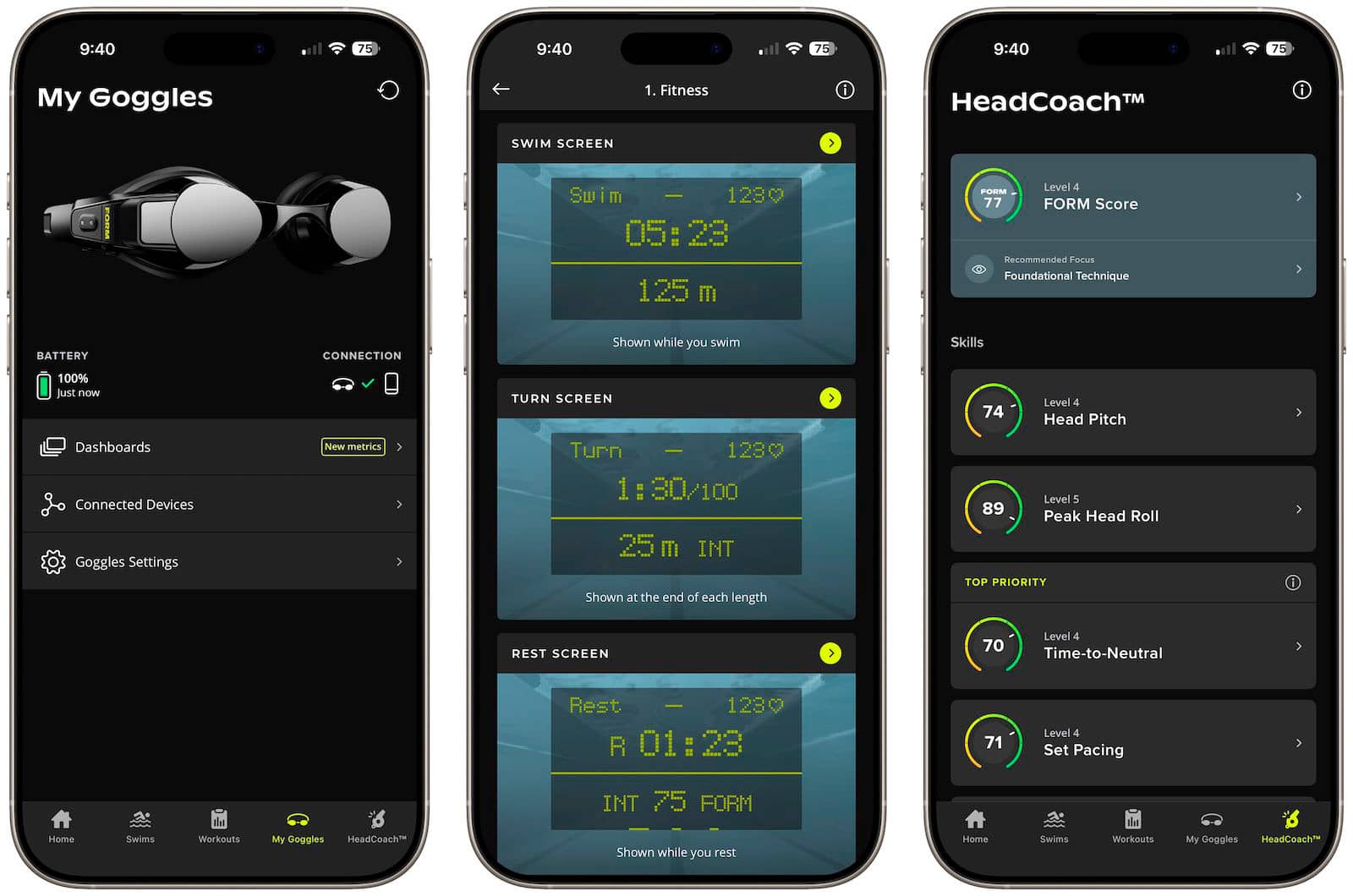 Також система розраховує загальний FORM Score оцінюючи ефективність техніки плавання. Окуляри дозволяють налаштувати до п'яти панелей відображення даних. Є готові профілі: Фітнес, Техніка, Темп та Інтервали, а п'ятий можна створити з нуля.