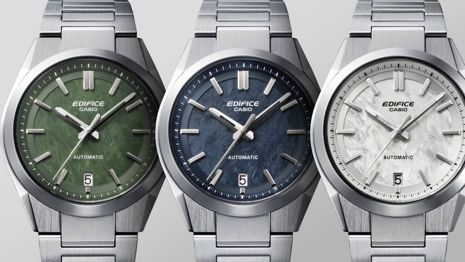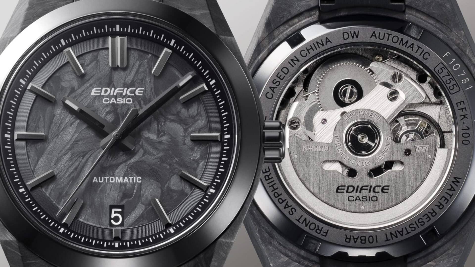 Дизайн підкреслюють скелетонізовані стрілки для кращої читальності, дзеркально відполіровані накладні мітки та циферблатне кільце з матовим шліфуванням. Модель EFK-100XPB-1A поєднує корпус із кованого карбону з поліуретановим ремінцем, тоді як інші варіанти комплектуються сталевими браслетами з чергуванням полірованих та сатинованих ланок. Всі годинники захищені сапфіровим склом зі стійким до подряпин покриттям і мають водозахист до 10 бар.