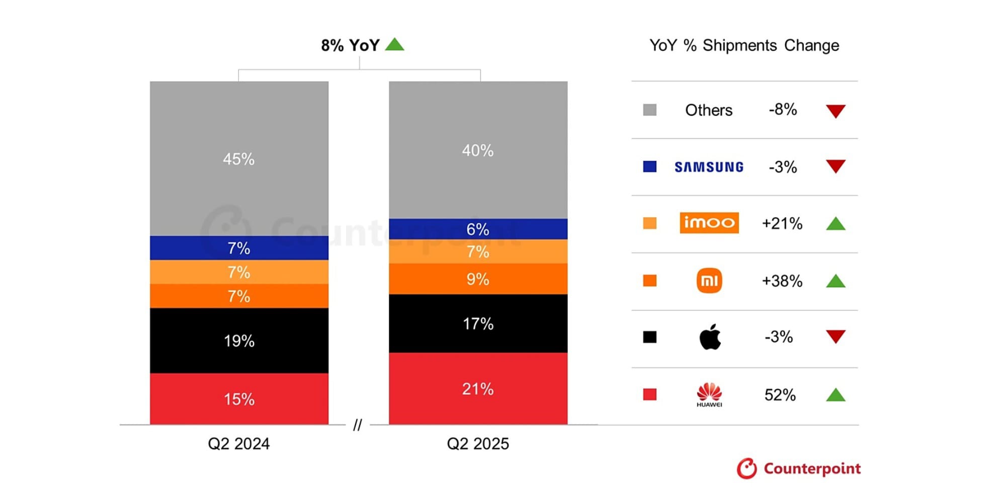 У другому кварталі 2025 року глобальні постачання збільшилися на 8% у річному обчисленні, перервавши п'ятирічний спад. Продаж Huawei виріс на вражаючі 52% — завдяки високому попиту в Китаї та різноманітності асортименту в ціновому діапазоні від 100 до 400 доларів. Успіху також сприяла зростаюча популярність бренду в Європі, на Близькому Сході, в Африці та Азіатсько-Тихоокеанському регіоні.