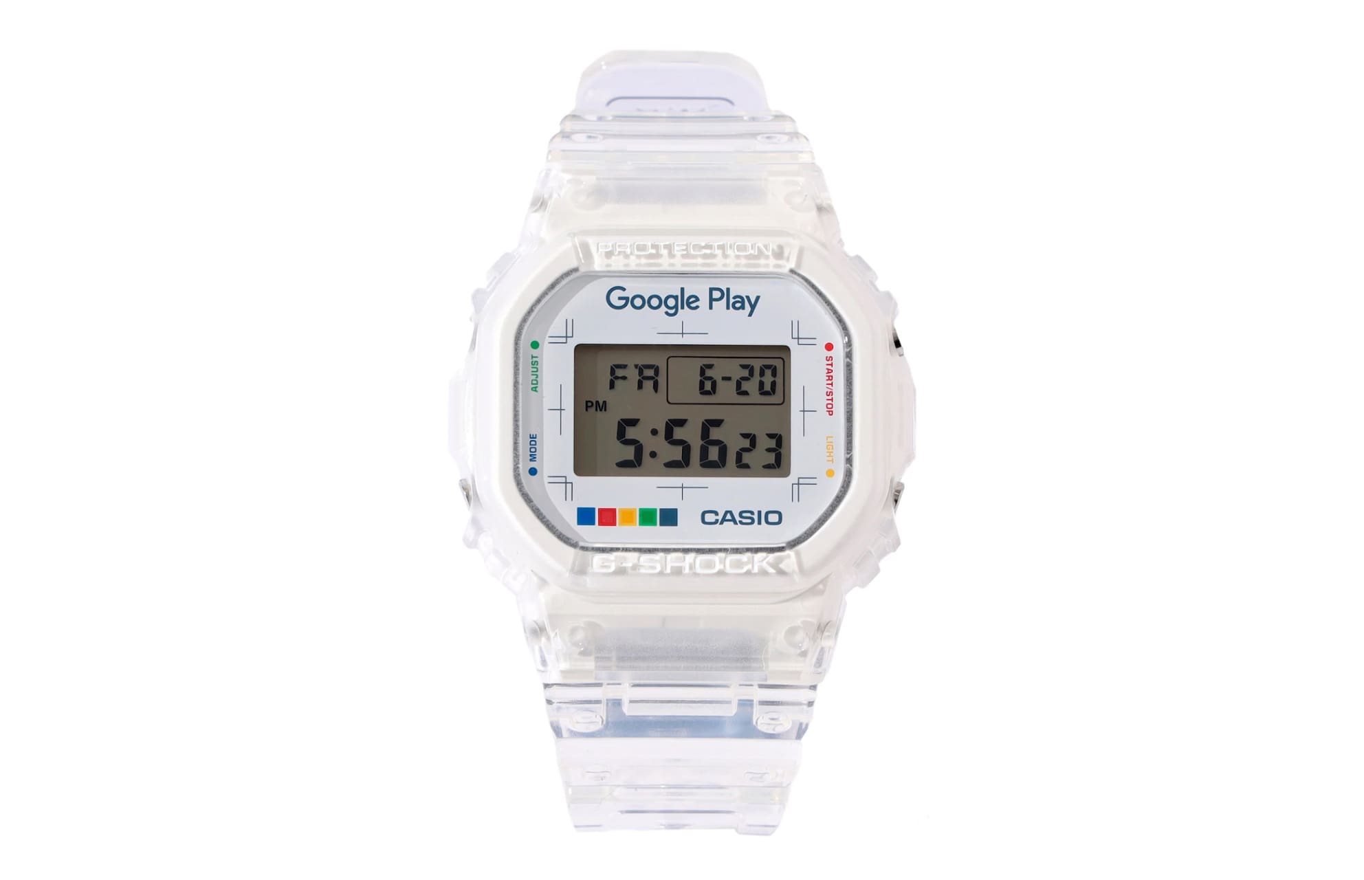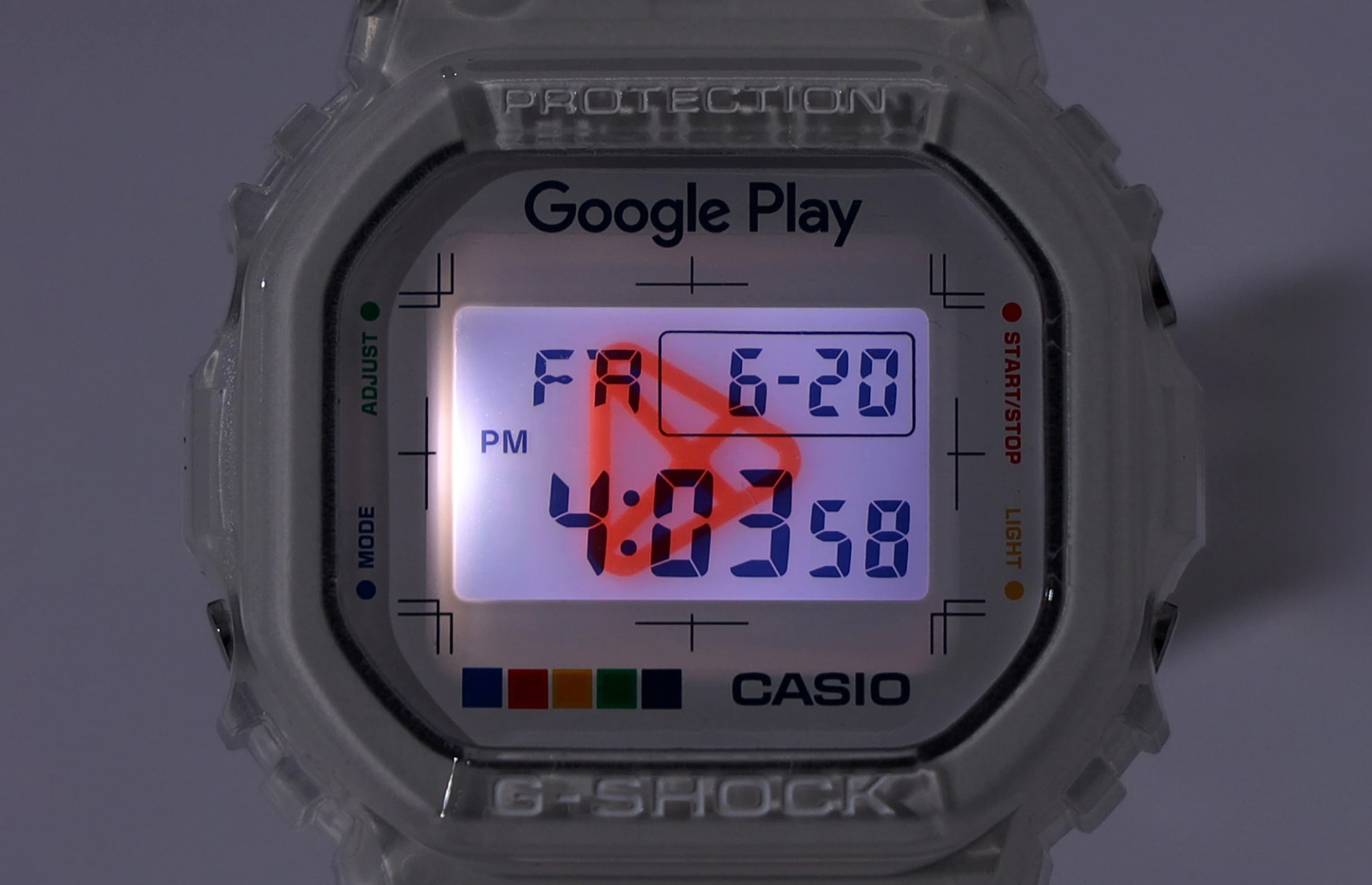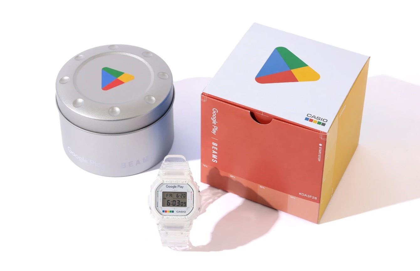 Головна особливість новинки — повністю прозорі корпус та ремінець зі смоли. На циферблаті розмістили логотип Google Play та кольорову смугу із фірмовими кольорами сервісу. Під час увімкнення підсвічування на екрані з'являється яскравий червоний трикутник — ще один символ магазину програм.