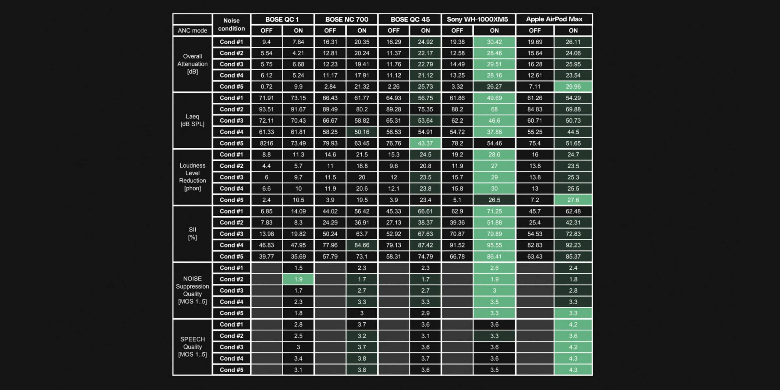 У своїх тестах експерти Head Acoustics оцінювали роботу ANC за низкою різних параметрів, у тому числі щодо загасання частоти, зниження рівня гучності, розбірливості мови та інших. Усі результати у таблиці нижче.