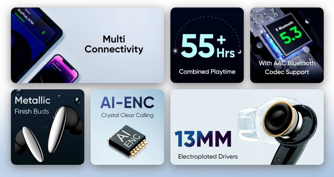 Пристрій підтримує технологію AI-ENC (штучний інтелект для придушення навколишнього шуму, яка ефективно усуває шуми фону, покращуючи чіткість звуку під час розмов. Навушники пропонують до 55 годин автономної роботи. Завдяки технології Swift Charge, всього 10 хвилин заряджання забезпечується 500 хвилин відтворення.