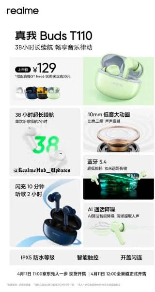 Realme Buds T110 представлено у чотирьох колірних варіантах — чорному, білому, зеленому та синьому. Вага навушника складає всього 4.09 г. Навушники оснащено динамічним драйвером 10 мм та композитним дифузором з покриттям із титану на основі PEEK+TPU.