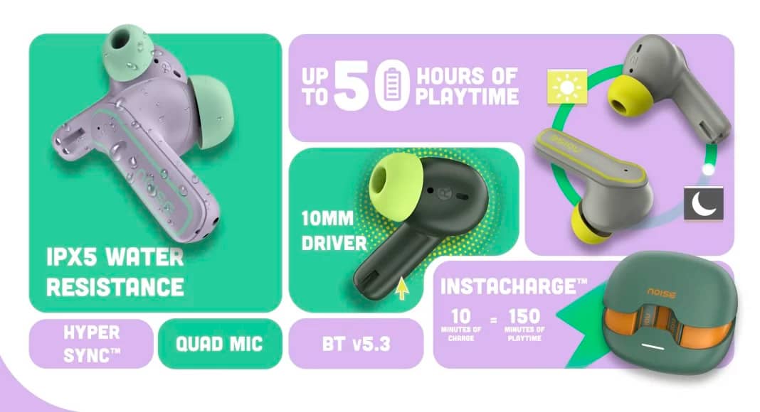 Noise Pop Buds оснащені драйверами діаметром 10 мм, що підтримують технологію Quad Mic Environmental Noise Cancellation, яка покращує чіткість звуку при дзвінках.
