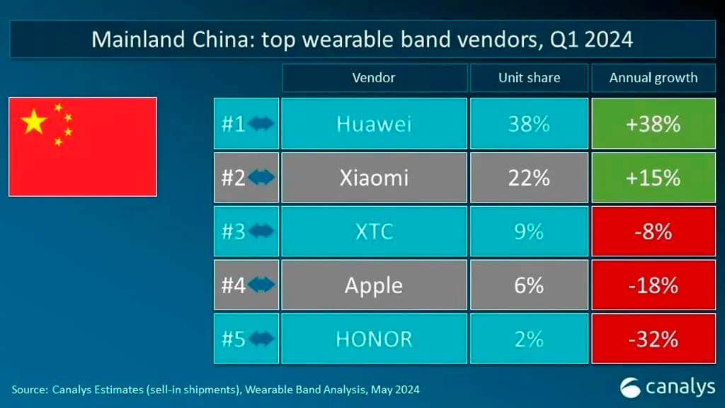 У Китаї Huawei опинилася на першому місці як за обсягами відвантажень, так і темпом зростання — обидва показники становлять 38%. Xiaomi продемонструвала результат у 22% та 15% відповідно. Замкнув трійку лідерів бренд XTC, який поставив 9% від загального обсягу смарт-годинників. Apple і Honor, які замикають топ-5, у першому кварталі 2024-го відвантажили в КНР менше пристроїв, ніж у той же період минулого року (на 18% та 31% відповідно).