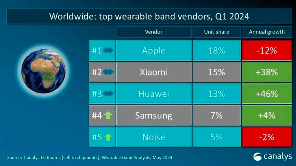 Samsung з часткою ринку 7% і зростанням на 4% зайняла четвертий рядок світового рейтингу. На п'ятій розмістився індійський бренд Noise.