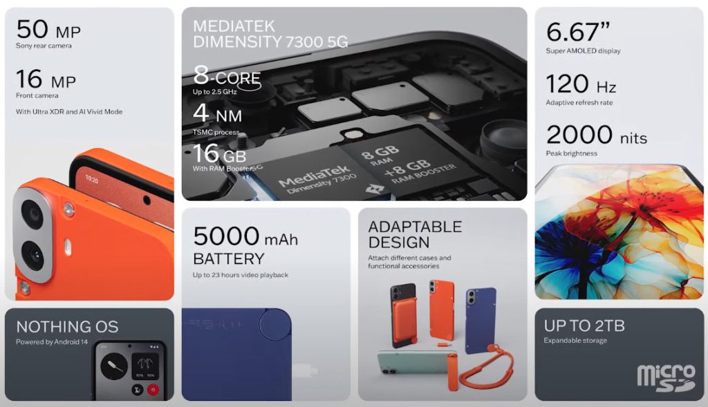 Основна камера на 50 Мп Sony. Вона доповнюється допоміжним датчиком глибини на 2 Мп. Фронтальний модуль — на 16 Мп. Також варто відзначити наявність стереодинаміків, підтримку 5G та NFC, слот для двох SIM-карток та сканер відбитків під екраном. Працює новинка з Nothing OS 2 на базі Android 14.
