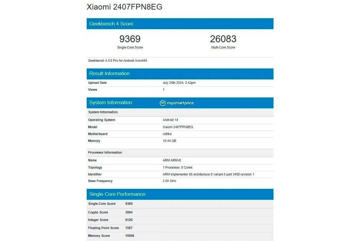 У тесті Geekbench пристрій показав результат 9369 балів в одноядерному режимі та 26 083 бали в багатоядерному режимі. Варто зазначити, що тестування проводилося на версії Geekbench 4.4 для Android, а не на новішій версії 6.x.