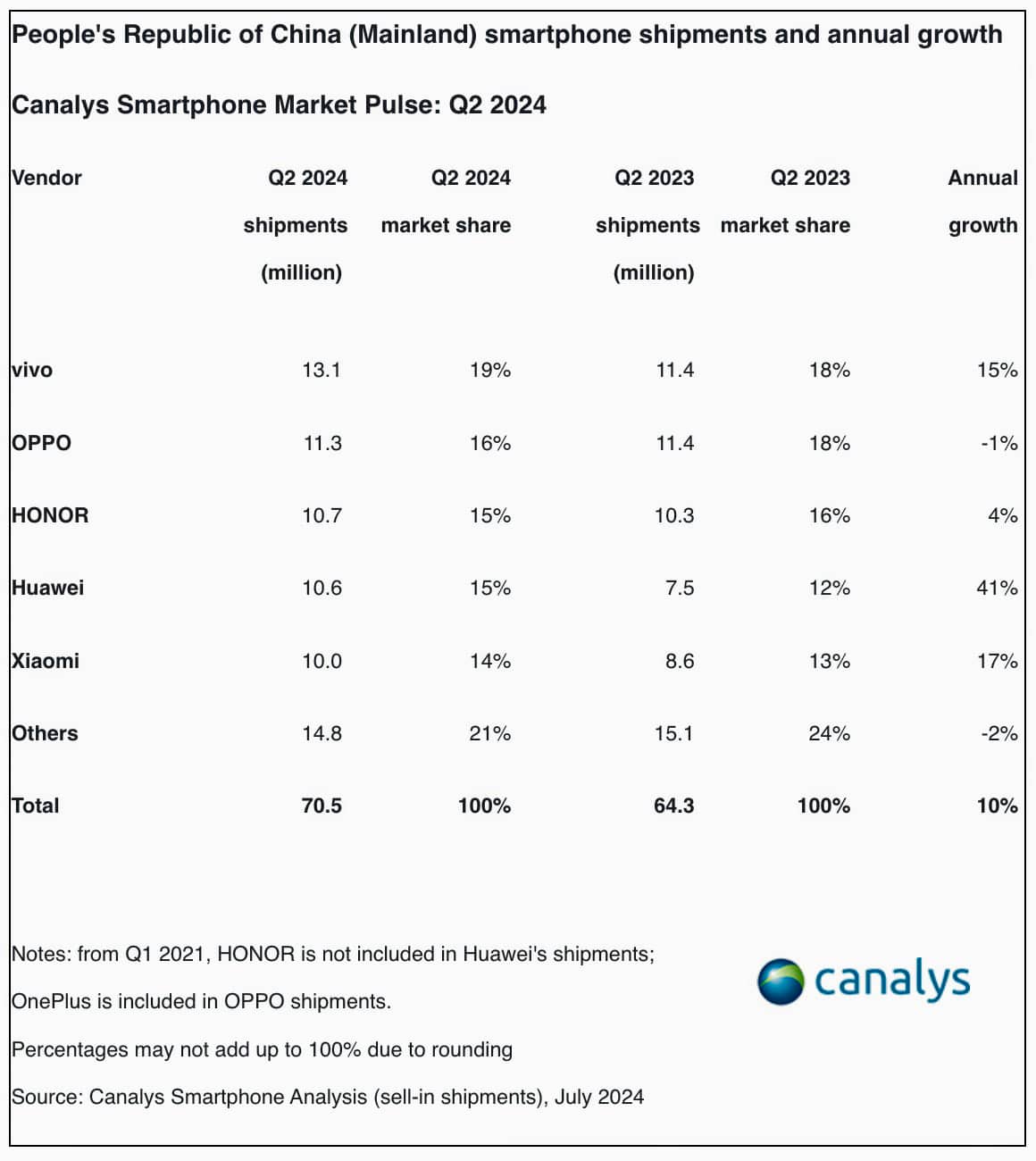 У топ-5 виробників з постачання смартфонів в Китаї входять Vivo (13,1 млн), Oppo (11,3 млн), Honor (10,7 млн), Huawei (10,6 млн) і Xiaomi (10 млн).